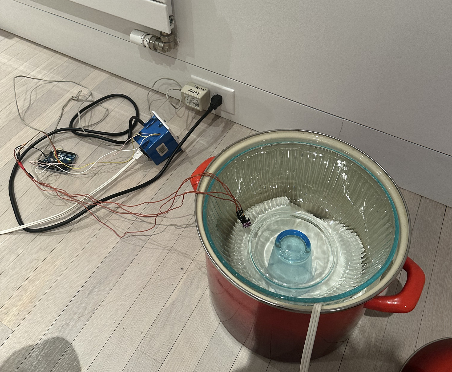 To address this challenge, I designed a custom proofing chamber using an Arduino, a temperature sensor, and a heating pad. The build features a 5V relay housed in a blue enclosure that interfaces a standard 120V plug with the Arduino's digital output. A temperature sensor was also integrated so that the system can monitor the internal climate; if the temperature falls below the desired range, the Arduino activates the heating pad, and once the target is met, the pad is turned off. By placing this setup inside an oven, I created a high-volume environment with precise temperature regulation.